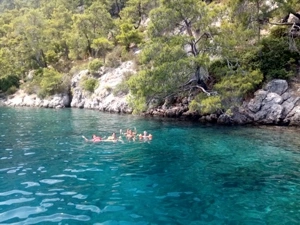 A lunch is included in the trip cooked on the boat which a verity of food including fresh chicken, fish and other traditional Turkish meat dishes. A buffet spread of salads and fresh locally sourced vegetables compliment the freshly cooked food, prepared on board. You can also have both soft and alcoholic drinks ice cold from the fridge. There is plenty of choice of things to do on your trip including stops at secluded bays, swimming, snorkelling and plenty of lovely coast line to take in whist relaxing on deck.
